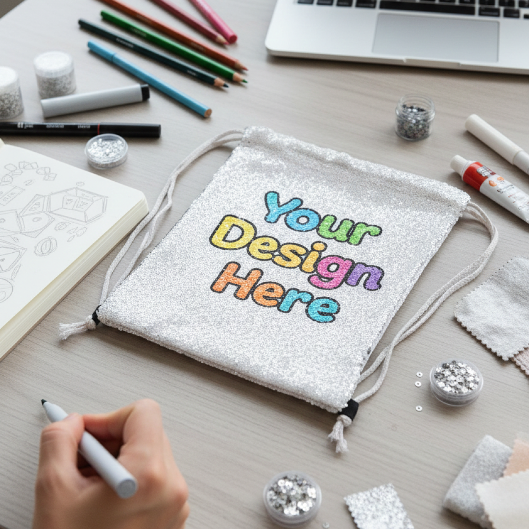 Reversible sequin pouches with hidden printed artwork.